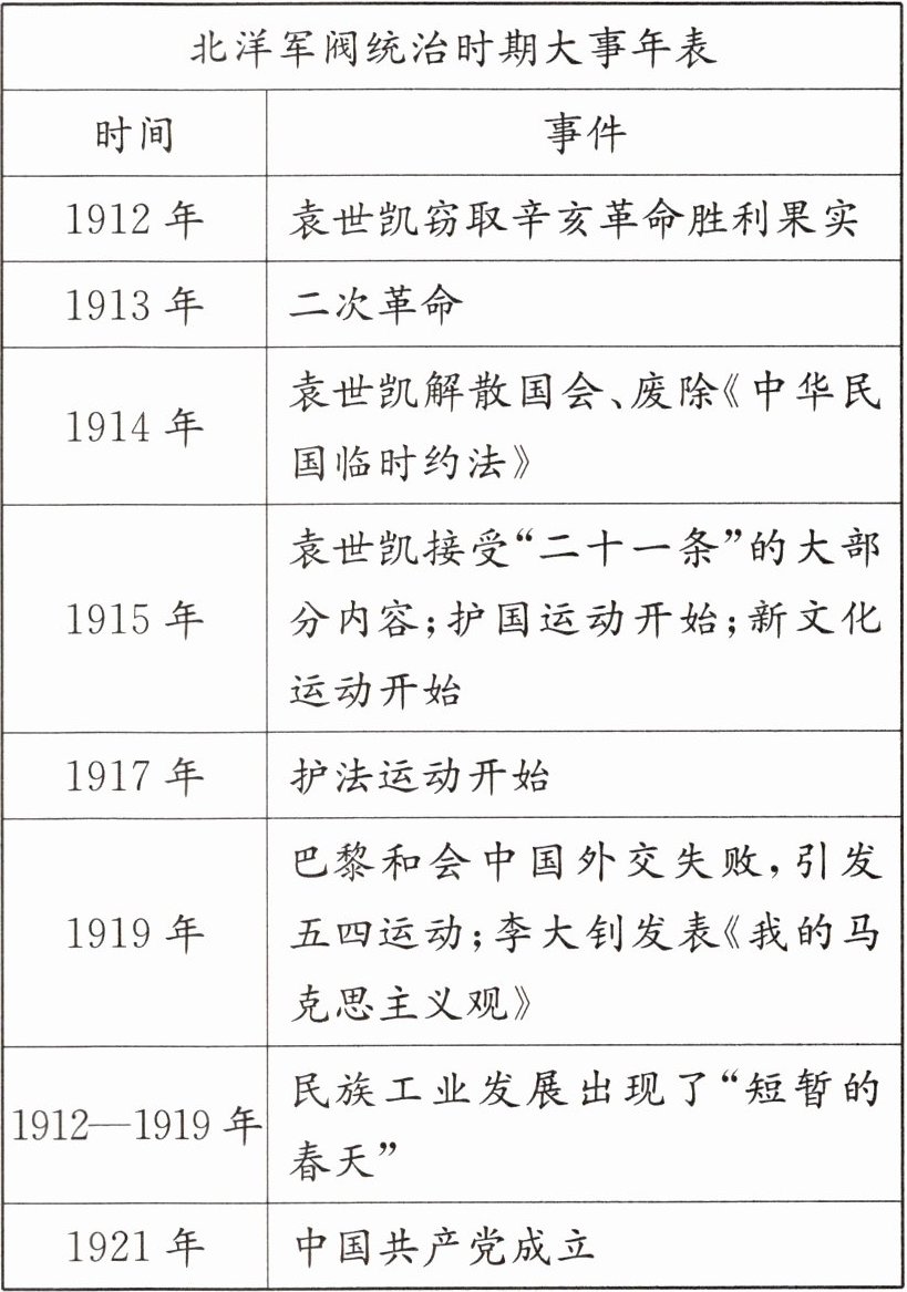 论述:北洋军阀统治时期中国历史显现光明。1912—1919年,中国民族工业发展迎来“短暂的春天”,随着资本主义的发展,资产阶级力量增强,掀起了以民主与科学为口号的新文化运动。无产阶级队伍随之壮大,五四运动中无产阶级作为独立政治力量登上历史舞台,马克思主义得到广泛传播。1921年,中国共产党成立,自从有了中国共产党,中国革命的面貌就焕然一新了。