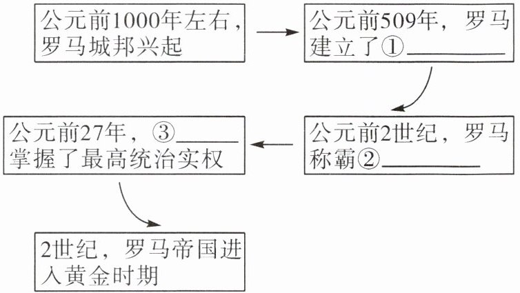 公元前1000年左右,→公元前509年,罗马→公元前2世纪,罗马→公元前27年,③→2世纪,罗马帝国进入黄金时期
