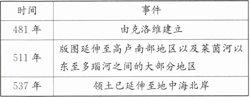 |511年|版图延伸至高卢南部地区以及莱茵河以东至多瑙河之间的大部分地区|