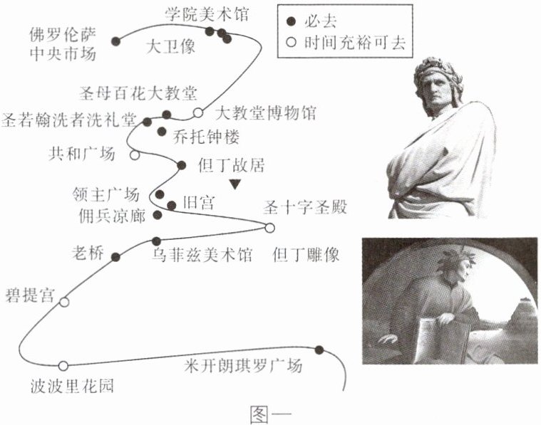 (1)中考新考法 撰写解说词 佛罗伦萨是但丁的故乡,这里到处可以寻觅到但丁的“身影”。从矗立在圣十字大教堂前的但丁雕像、但丁故居博物馆,再到但丁的著作和相关纪念品,无处不凸显这位文豪与城市的深刻渊源。第(1)小组成员去走访但丁故居,请你为他们撰写一篇精炼介绍但丁的解说词。(4 分)