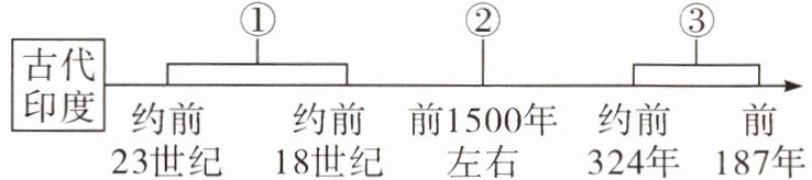 (1)结合古代印度文明的发展,列举①时期印度河流域存在的两个文明遗址,写出②时期对应的事件,指出③所对应的时期。(4 分)