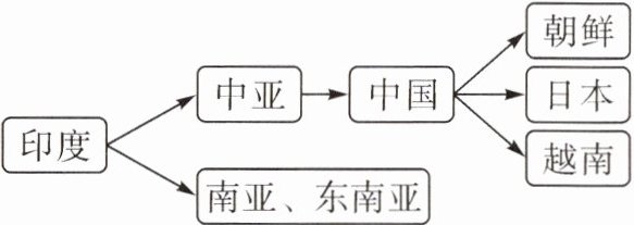 B [解析]结合所学知识可知,佛教创立于古代印度。公元前 3 世纪后,佛教开始向外传播。公元前 1 世纪,佛教经中亚传到中国新疆,再传入中国内地,后又传到朝鲜、日本和越南等国。佛教往南经锡兰,传到缅甸、泰国、柬埔寨等国。因此,该示意图反映的是佛教向外传播的路线。故选 B 项。
