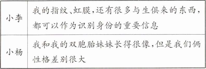| 小李 | 我的指纹、虹膜,还有很多与生俱来的东西,都可以作为识别身份的重要信息 |
