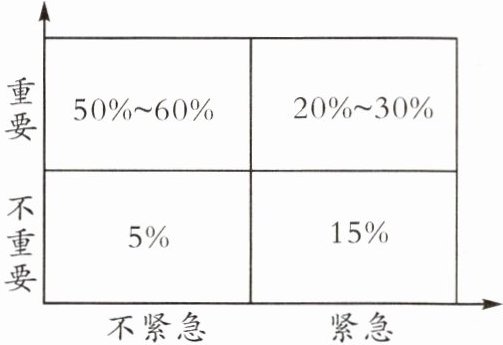 两张表反映了该中学生暑假时间安排不尽合理等问题。①要合理分析任务的重要程度和紧急程度,应将大部分时间用于完成重要且紧急的假期任务,如编程学习、预习化学、复习物理等;再完成重要且不紧急的事情,如体育锻炼、社会调查等;看电视、玩游戏、刷短视频属于不重要也不紧急的事情,所占时间的比重不能太多。②要制定具体的任务完成时间表,规划任务完成所需要的时间,学会珍惜时间,提高效率。