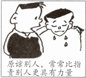 A [解析]本题考查尊重他人、文明有礼。漫画中,原谅别人,常常比指责别人更具有力量。这启示我们宽容是一种美德,要学会宽以待人;宽容能减少摩擦,建立良好人际关系。①④符合题意;“就能”的说法太绝对,②错误;我们要帮助他人改正缺点,而不是欣赏他人的缺点,③错误。