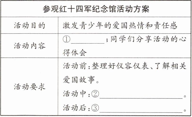 (2)学校准备组织学生去红十四军纪念馆参加爱国主义教育活动,请你帮助完成下面的活动方案。
