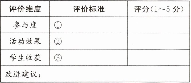 (4)活动结束后,社团需要对本次活动进行评价。请你在下表中写出本次活动的评价标准和改进建议。