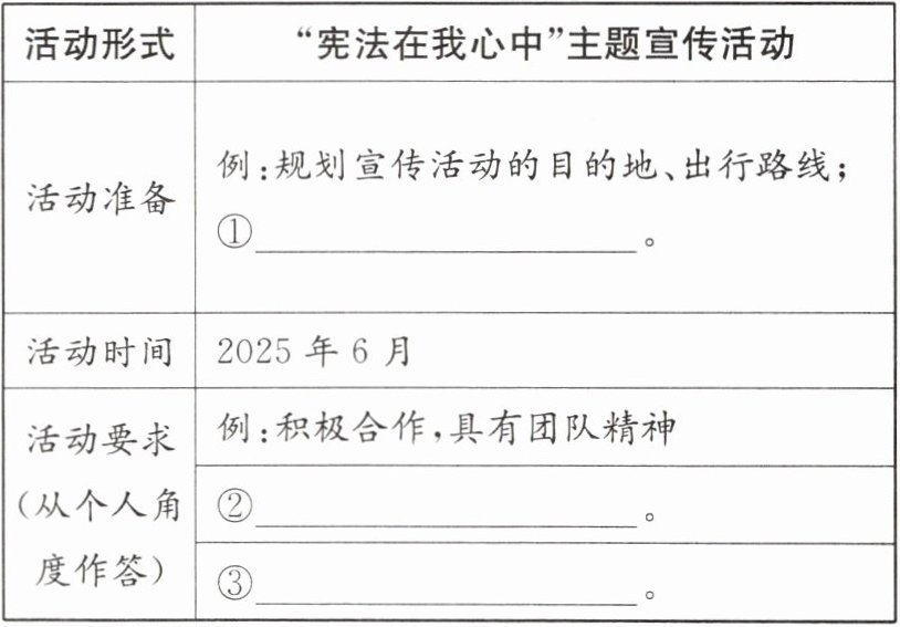|活动要求(从个人角度作答)|例:积极合作,具有团队精神②______。③______。|