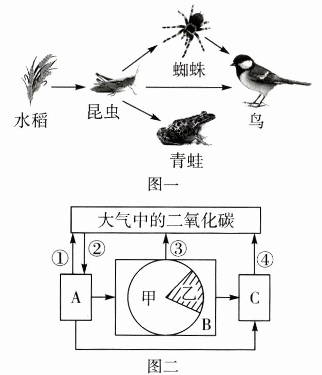 (5)图二中包含的食物链是______(用字母、甲、乙和箭头表示),其中甲对应图一中的______。