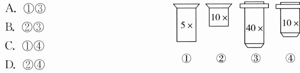 4. 右下图为显微镜的四种镜头,要想使视野中观察到的细胞数量最少,体积最大,应选择的镜头组合为( )。