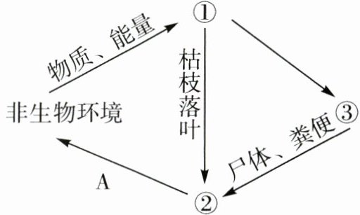 A [解析]据图分析可知,①可以利用非生物环境中的物质、能量,因此①是生产者,能通过光合作用制造有机物。②可以分解枯枝落叶和尸体、粪便,因此②是分解者,③是消费者。