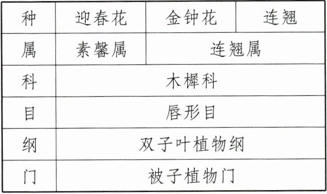 19. “金英翠萼带春寒,黄色花中有几般。”初春的迎春花凌寒而开,黄艳明丽,令人赏心悦目。迎春花与金钟花、连翘的花朵十分相近。三种植物的分类关系如下表,以下说法正确的是( )。