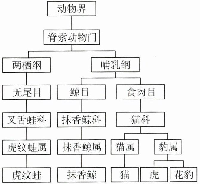 (1)根据题图可知,虎与花豹同为豹属,所以虎与花豹亲缘关系最近;虎与虎纹蛙同为脊索动物门,所以虎与虎纹蛙亲缘关系最远。
