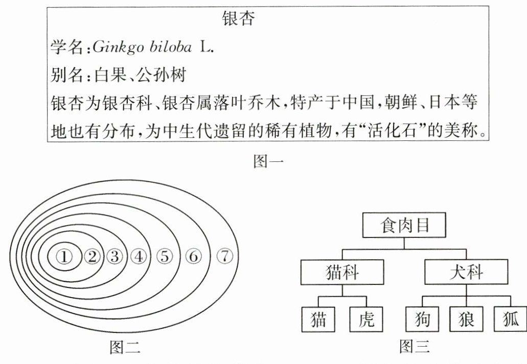 (1)18世纪,瑞典的博物学家______创立的生物命名方法,成为了国际统一的生物命名法,这种命名法是______。图一银杏标牌中,Ginkgo表示银杏的______名。