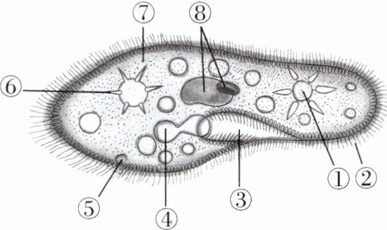 ② 纤毛 ③ 口沟 ④ 食物泡 ⑤ 胞肛 ⑥ 收集管
