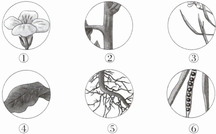 C [解析]分析题图,①是花、②是茎、③是果实、④是叶、⑤是根、⑥是种子。绿色开花植物的六大器官分为营养器官和生殖器官,根、茎、叶属于营养器官,花、果实、种子属于生殖器官。