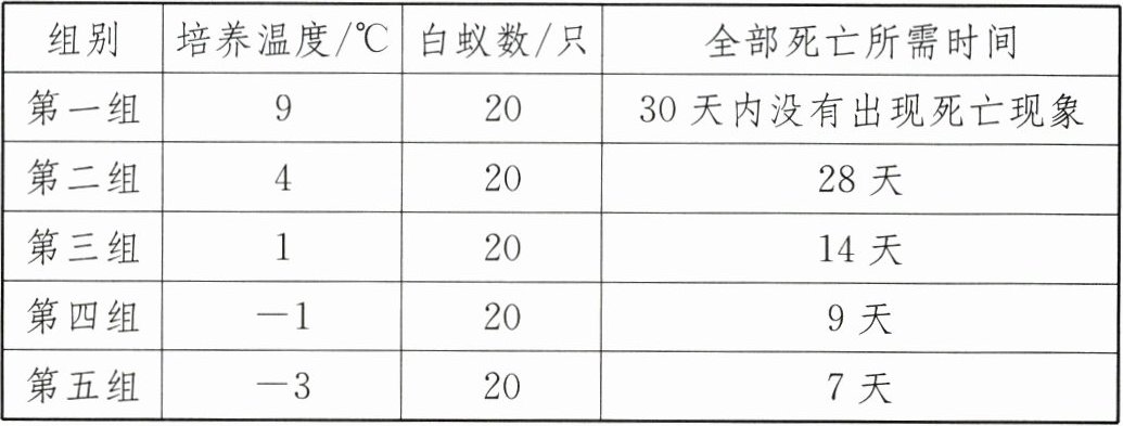 23. (9分)白蚁是一种常见的害虫。有人为了研究温度对白蚁存活的影响,将白蚁分成五组,在不同温度下饲养(其他条件相同),记录了各组白蚁全部死亡所需的天数,结果如表所示,分析回答下列问题: