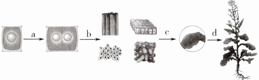 C [解析]细胞是生物体结构和功能的基本单位,细胞经过分裂、分化产生了不同的组织。a表示细胞分裂、b表示细胞分化、c表示由组织构成器官,植物体没有系统层次,d表示由器官构成植物体,C正确。