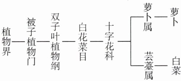 5(2025·湖南株洲醴陵市期末)萝卜和白菜是常见蔬菜,这两种植物在生物学上的分类地位如下图所示。据图可知,萝卜、白菜相同的最小分类等级是(