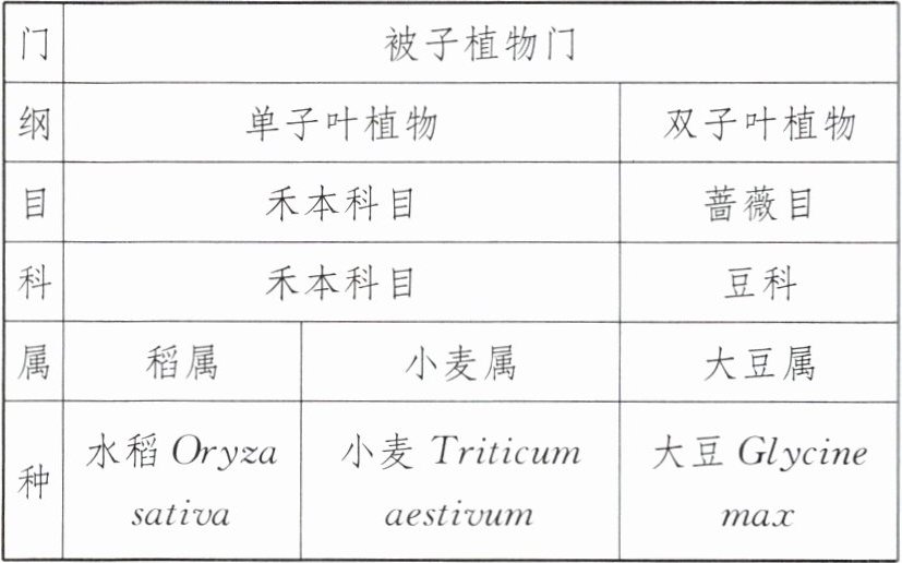 20(2025·南通如皋市期末)水稻和小麦是我国主要的粮食作物,大豆是我国重要的油料作物,它们的分类关系如下表所示。相关叙述错误的是(