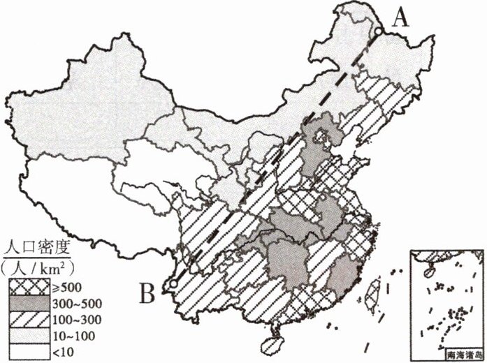 4.D 5.A [解析]第4题,读图可知,黑河—腾冲一线是我国人口地理分界线,该线东南部人口多,西北部人口少。其两端所在省级行政区分别是黑龙江省和云南省,黑龙江省简称黑,云南省简称云或滇。第5题,黑河—腾冲一线以东地区,人口数量多、密度大,该界线以西地区,人口数量少、密度小,我国人口的分布特点是东南多,西北少。