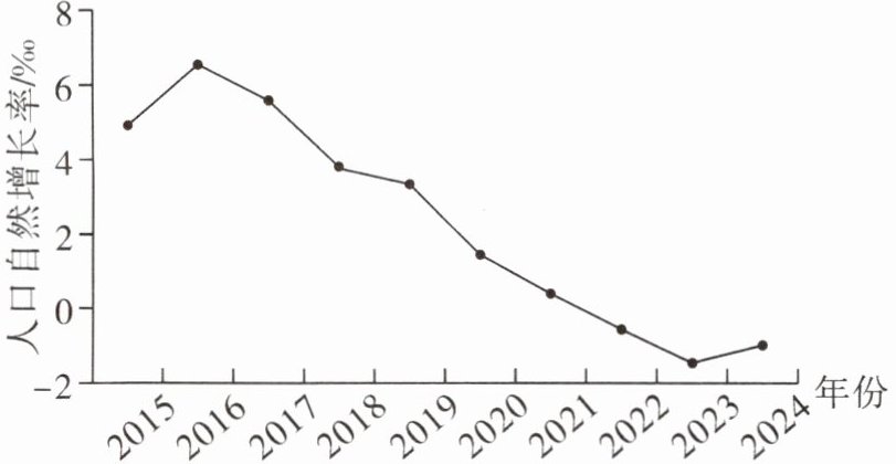 (2024·东营中考改编)下图示意我国2015—2024年人口自然增长率变化情况。读图回答10~11题。