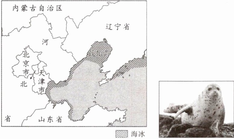 (2024·辽宁中考)斑海豹每年都会从远方洄游到辽东湾,在海冰上栖息产仔,成为一道奇妙景观。读图回答3~4题。