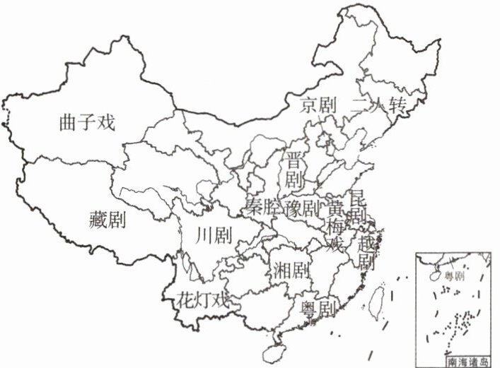 传统文化 地方戏曲 (2024·新疆中考)“小舞台,大智慧”,中国戏曲源远流长,种类繁多,百花齐放。读我国部分地方戏曲分布图,回答5~6题。