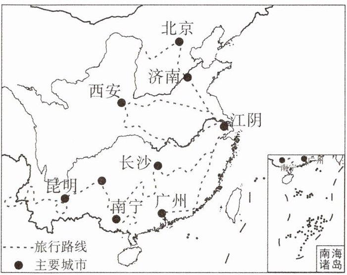 传统文化 《徐霞客游记》 徐霞客是我国著名的地理学家和旅行家,他的《徐霞客游记》是不可多得的地理学巨著。徐霞客一生足迹遍及现在的 21 个省级行政区(右栏图)。读图回答 7~8 题。