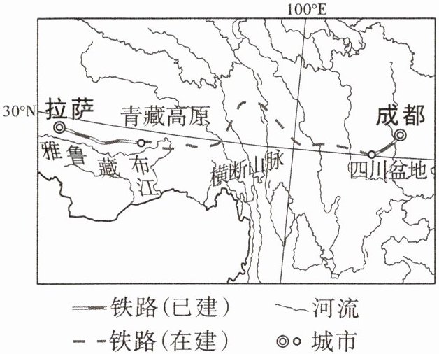 川藏铁路“八起八伏”,累计爬升的高度超过 14 000 m,被称为“一辆巨大的过山车”。读建设中的川藏铁路示意图,回答 9~10 题。