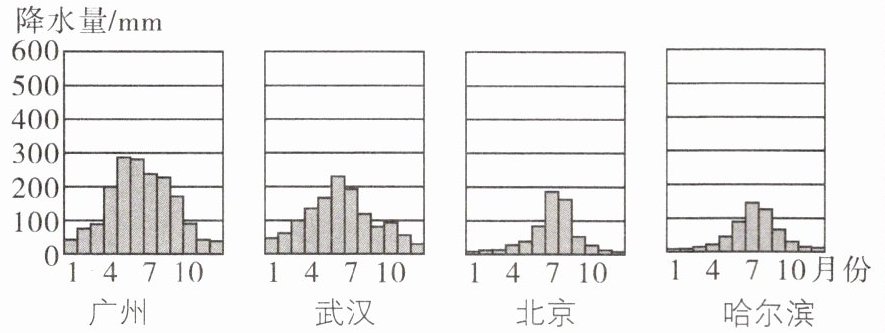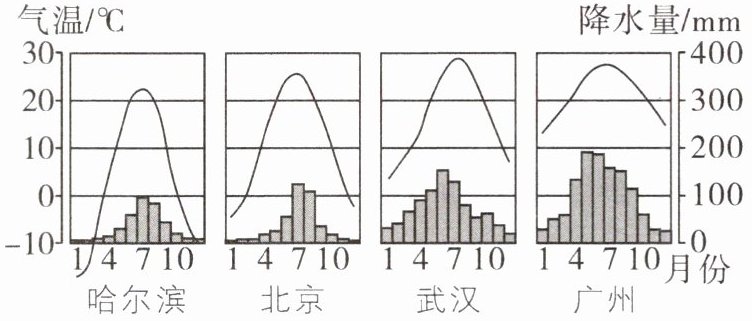 5.A 6.C [解析]第5题,哈尔滨和北京为温带季风气候,武汉和广州为亚热带季风气候。季风气候的显著特点是雨热同期。第6题,四城市都是季风气候,降水集中在夏季,且季节变化大,易发生旱涝灾害。