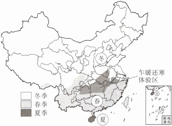 (2024·成都中考)2024年3月初,我国南方大部分地区已进入气象学意义上的春天,但部分地区仍乍暖还寒,体感上依旧寒冷。下图示意3月6日全国入春进程。据此回答7~9题。