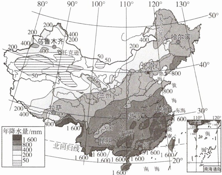 3.D 4.A [解析]第3题,读我国年降水量分布图可知,我国降水空间分布不均,自东南沿海向西北内陆递减。第4题,读我国四个城市的降水量柱状图可知,四个城市降水均集中在夏季,降水量季节变化大,雨季长短不一。