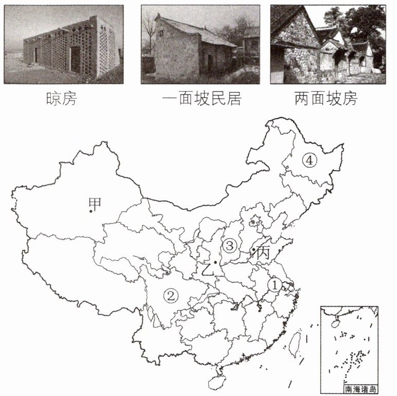 (4)下图中的民居,最有可能在图中①②③④四地中的____地。根据屋脊坡度推测,这里比丙地的降水____(多/少),判断的理由是____。