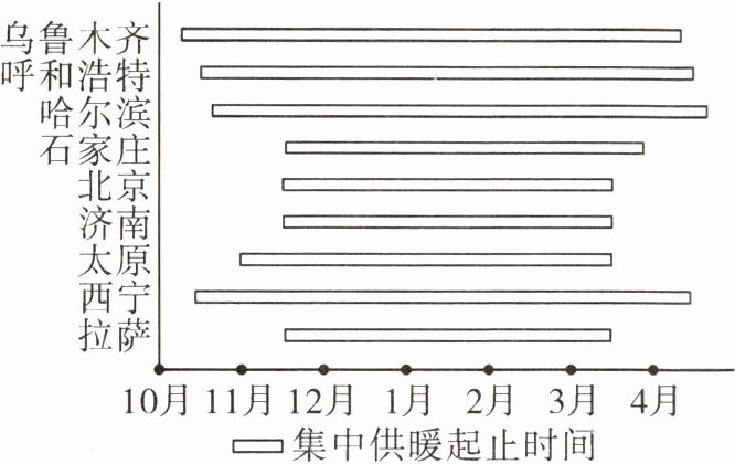 (2025·湖南衡阳常宁期末)中国疆域辽阔,秋景美不胜收。当漠河雪花开始漫天飘舞时,三亚的街头依然裙角飞扬。下图为我国集中供暖起止时间图。据此回答13~14题。