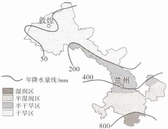 10.C 11.C 12.B [解析]第10题,读图可知,该省区降水的空间分布特点是自东南向西北减少。第11题,甘肃省主要属于温带大陆性气候,降水少,气候干旱。敦煌莫高窟的壁画能够保存上千年之久的主要自然原因是气候干旱,风沙掩埋。第12题,读图可知,该省区降水的空间分布特点是自东南向西北减少,其主要形成因素是海陆位置。