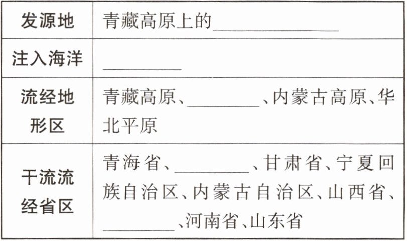 |干流流经省区|青海省、______、甘肃省、宁夏回族自治区、内蒙古自治区、山西省、______、河南省、山东省|