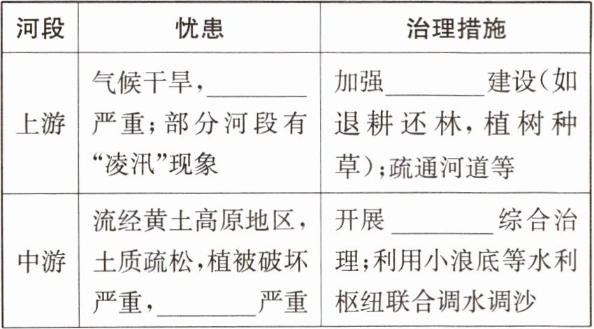 |上游|气候干旱,______严重;部分河段有“凌汛”现象|加强______建设(如退耕还林,植树种草);疏通河道等|