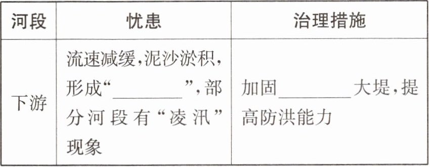 |下游|流速减缓,泥沙淤积,形成“______”,部分河段有“凌汛”现象|加固______大堤,提高防洪能力|