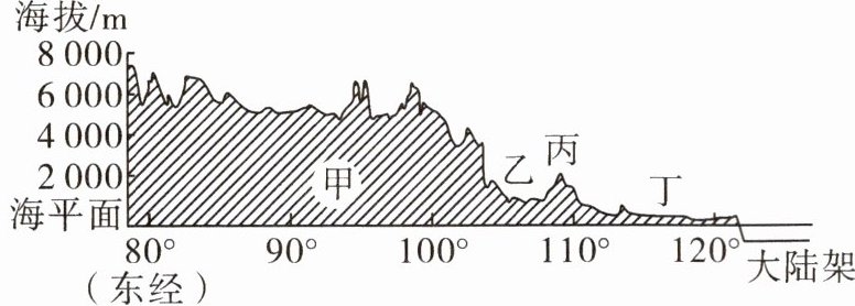 (2024·西宁中考)地形剖面图能直观地显示某一方向上地面的起伏和坡度的陡缓。读中国沿32°N纬线的地形剖面图,回答1~3题。