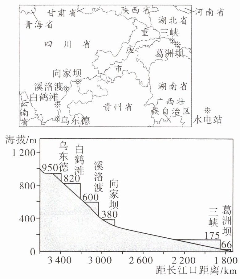 (2024·青岛中考)长江干流上的6座巨型梯级水电站,是实施“西电东送”的国家重大工程之一,将大量电力输送到电力紧缺的我国东部地区。下图示意长江干流上的6座巨型梯级水电站。据此回答8~9题。
