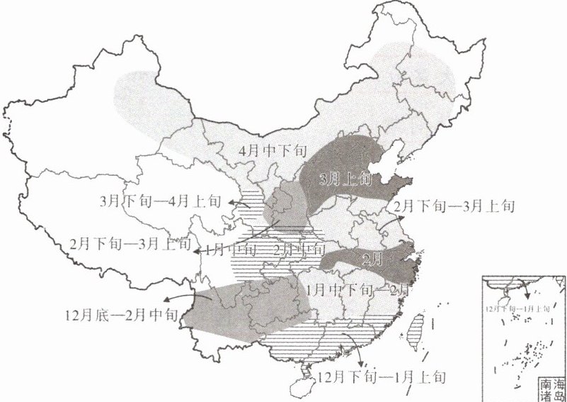 4.C 5.A [解析]第4题,广州市梅花最佳观赏期在12月下旬—1月上旬;昆明市梅花最佳观赏期在12月底—2月中旬;南京市梅花最佳观赏期在2月下旬—3月上旬,符合2月19日至3月15日这一时段;哈尔滨市梅花观赏期在4月中下旬。第5题,广东与江苏梅花最佳观赏期不同,主要是因为纬度位置的不同,导致气温差异,梅花花期不同。