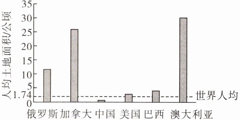 原创素养题 区域认知 我国陆地国土面积居世界第三位,土地资源总量丰富。读世界面积前六的国家人均土地面积(2020年),回答1~2题。