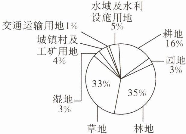 占比最大的是______,其次是______,耕地面积占16%,其余五种分别是水域及水利设施用地、城镇村及工矿用地、园地、湿地及交通运输用地。