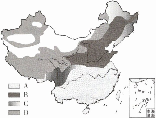 下图中A、B、C、D分别表示的是我国四种土地资源类型。读图回答8~9题。