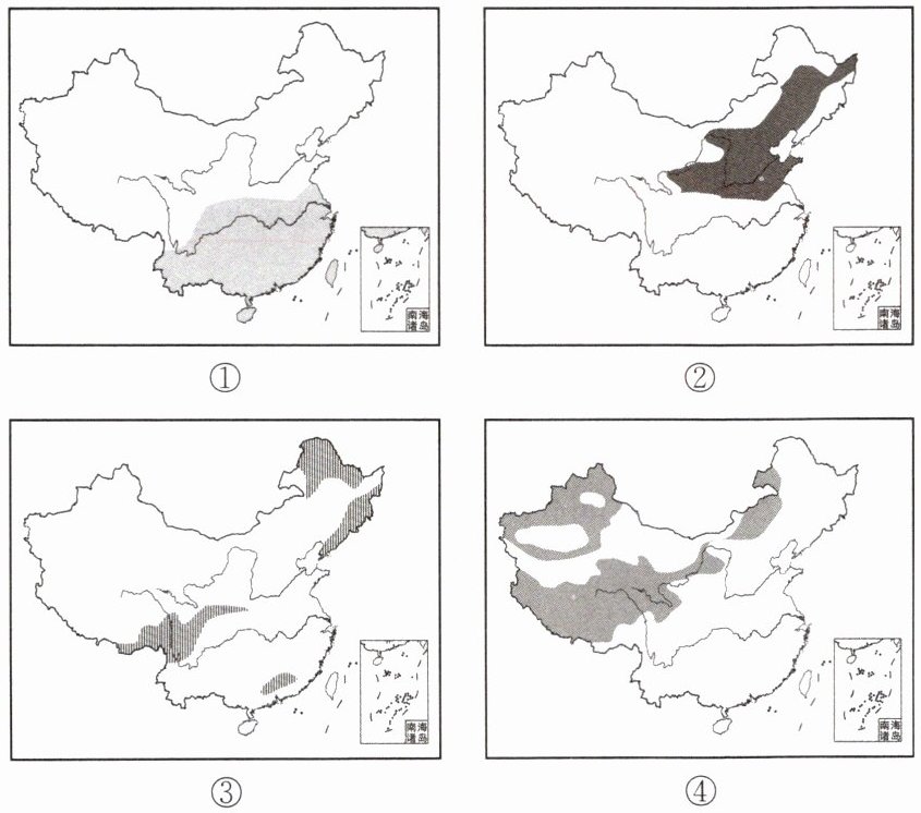 中国国土辽阔,土地资源总量丰富,而且土地利用类型齐全,但人均土地资源占有量小,而且各类土地所占的比例不尽合理。下图为我国林地、草地、旱地、水田四种土地资源的分布情况示意图。据此回答4~5题。