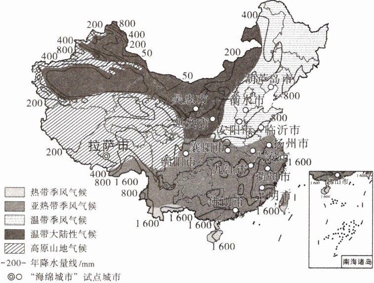 “海绵城市”是指城市能够像海绵一样在适应环境变化和应对雨水带来的自然灾害等方面具有良好的“弹性”。下图为我国“海绵城市”试点城市分布图。读图回答 7~9 题。
