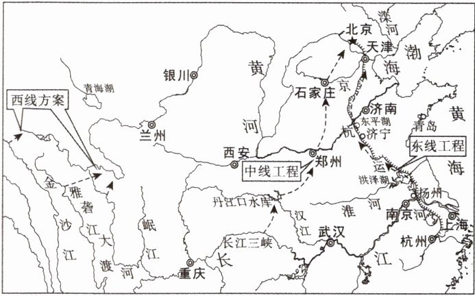 (2024·苏州中考改编)自 2014 年 12 月 27 日“南水”进京,北京已经推出阶梯水价,即居民用水价格= 水费+水资源费+污水处理费。按年度用水量计算,划分为三档,水价分档递增。下图为南水北调部分工程示意图。读图回答 5~6 题。