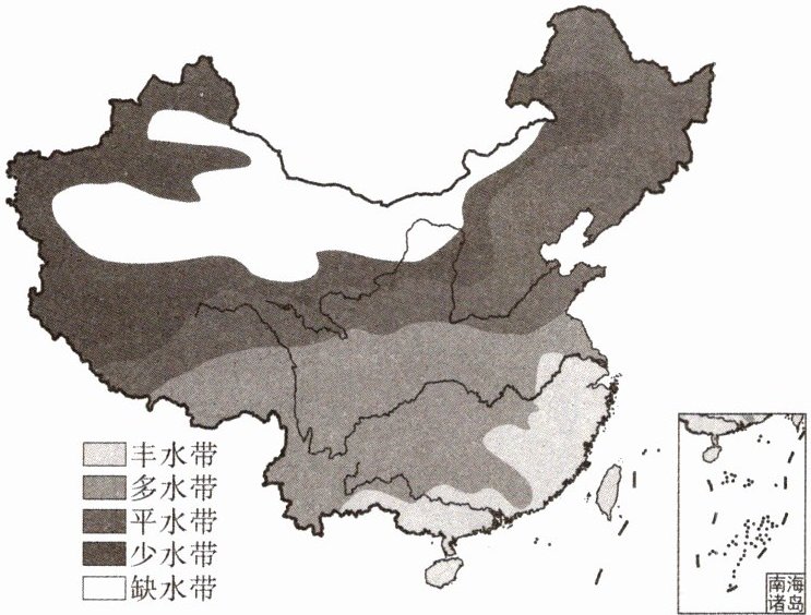 2. A 3. A [解析]第2题,读图可知,中国水资源地区分布特点是东多西少,南多北少。第3题,读图可知,平水带和少水带的分界线大致是400 mm年降水量线。