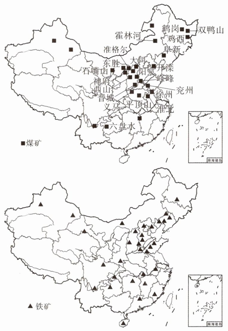 读我国煤矿分布图和铁矿分布图,回答1~2题。